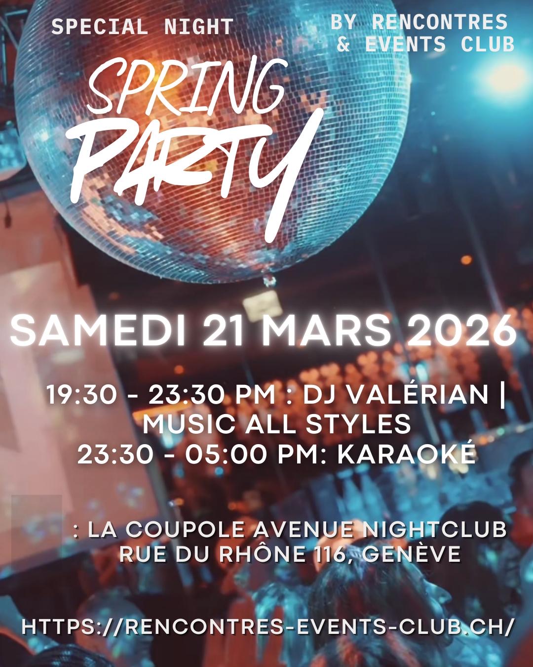 Rejoignez-nous dans un night-club historique de Genève pour célébrer le début du Printemps 2026. DJ Valérian vous fera danser avec un mix « All Styles » explosif jusqu’à 23h30 et ensuite venez faire un karaoké jusqu’à 5h00 du matin. Chapeau et lunettes pour faire la fête offerts.